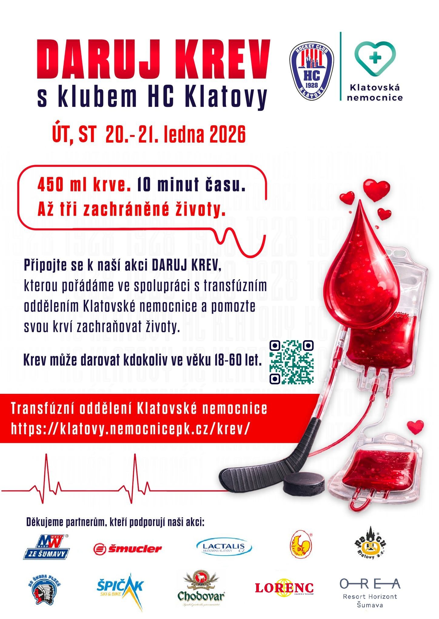 Daruj krev s klubem HC KlatovyKdy a jak se zapojit do akce?Přijďte darovat krev na transfuzní pracoviště Klatovské nemocnice 20 a 21. ledna