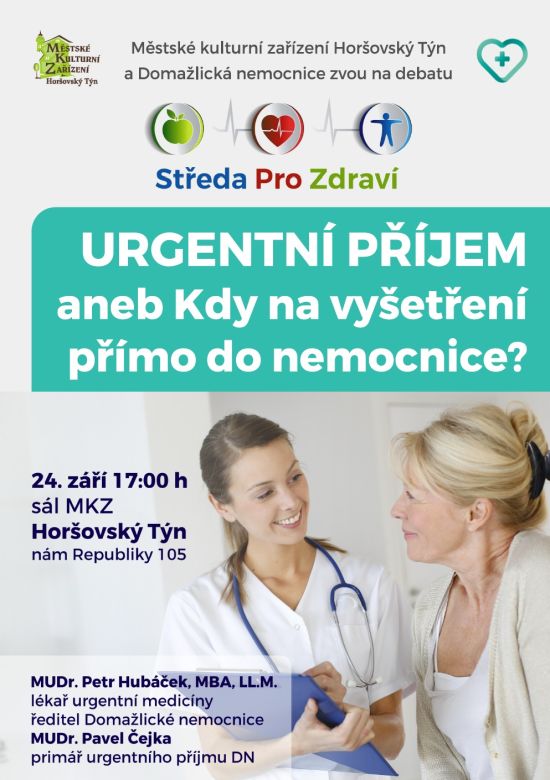 Domažlická nemocnice je první z nemocnic Plzeňského kraje, která ve svých prostorách zprovoznila klasický urgentní příjem pro vyšetření všech pacientů přicházejících v akutních stavech. A právě urgentního příjmu se bude týkat další díl vzdělávacích interaktivních podvečerů pro veřejnost Středa Pro Zdraví, které se konají v Městském kulturním zařízení Horšovský Týn. První podzimní setkání se uskuteční 24. září od 17 hodin. Celou debatu tentokrát uvede přímo ředitel Domažlické nemocnice MUDr. Petr Hubáček, který působí v nemocnici právě i jako lékař urgentního příjmu, a s veřejností bude hovořit i přímo primář urgentního příjmu Domažlické nemocnoice MUDr. Pavel Čejka. Téma se jmenuje Urgentní příjem aneb Kdy na vyšetření přímo do nemocnice. Debata je pro všechny zdarma. Není třeba se nikde rezervovat. Stačí přijít.
