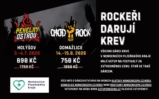 Dárcovství krve podporují také rockové festivaly Pekelný ostrov a Chodrockfest, které se konají v létě v Holýšově resp. v Domažlicích. Jejich organizátor nabízí opět všem dárcům slevu na vstupném a 36 dárců může na festival dokonce zdarma.